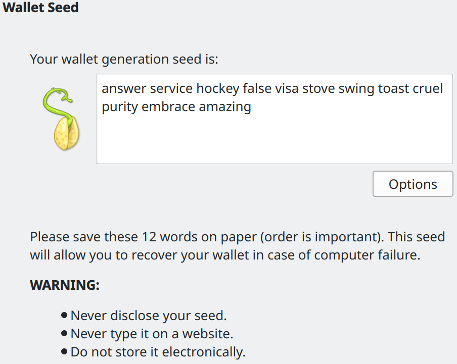 of all the private keys), with which you can restore your wallet if you