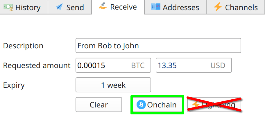 Use the “regular” Bitcoin onchain (on the blockchain), not the Lightning network (which requires special handling and is out of scope of this tutorial)