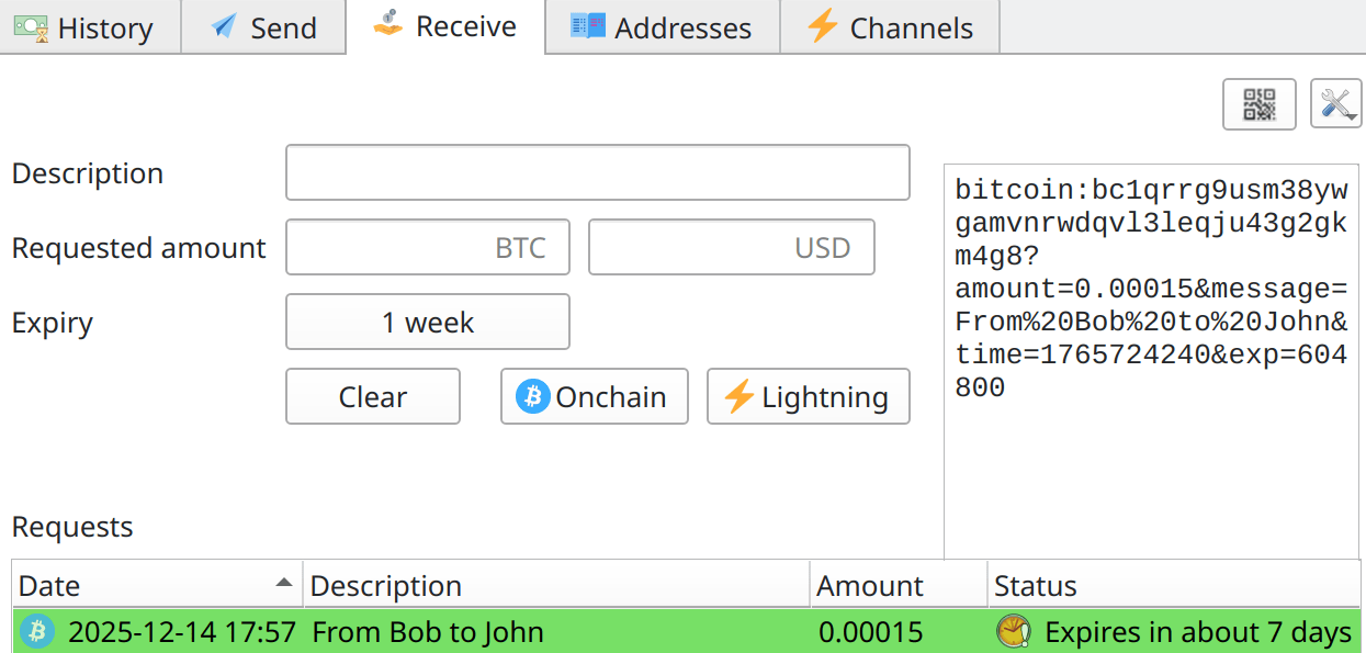 In the receive tab, you can create payment request for the other person, and send them the URI (link), which includes:
